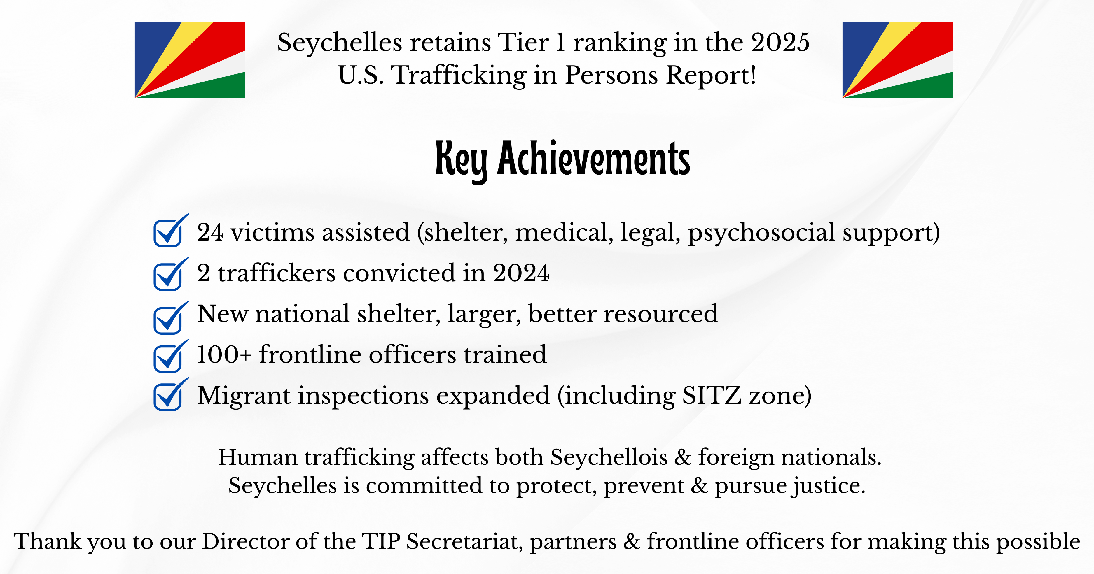 This recognition reflects Seychelles’ proactive and sustained actions to strengthen its national response to trafficking in persons. In advance of the 2025 report, the Government addressed several key recommendations made in earlier assessments, including: